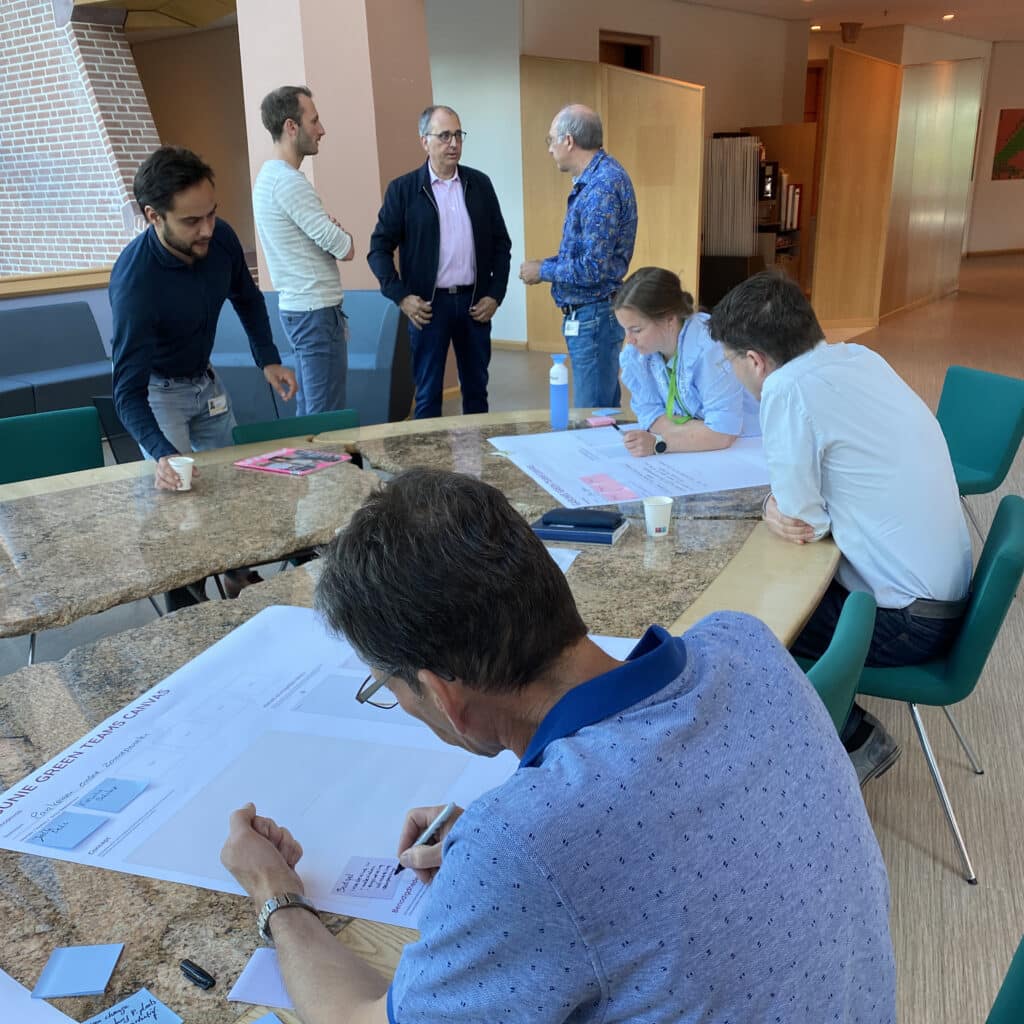 Hiervoor hebben we een gigantisch Green Teams Matchings Canvas ontworpen. Daar konden groepjes gezamenlijk vragen invullen als: wat zijn de voor- en nadelen van dit concept? Wat hebben we nodig om het waar te maken? En welke stakeholders zijn hierbij nodig? En, heel belangrijk: tot welke concrete acties leidt dit? Ah, de sleutelelementen voor een geslaagde date.