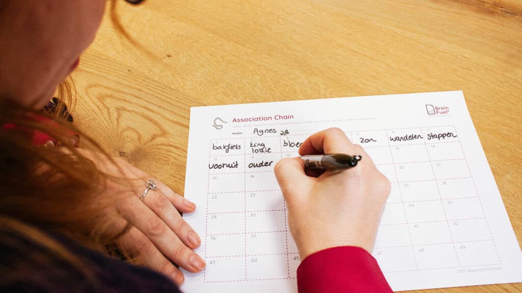Benodigdheden: Stiften, Association Chain-canvas (of papier). Optioneel: de Brain Fuel-kaarten